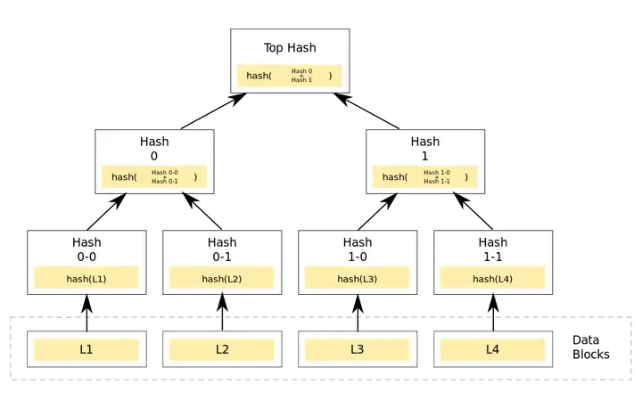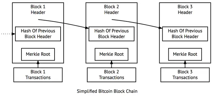 从创世区块开始,每 10 分钟左右全网发生的交易被打包进一个区块,每个区块都包含上一个区块头的哈希值,从而在块与块之间形成“链条”,这就是所谓的“区块链”: