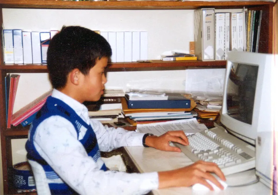 ● 赵长鹏记得小时候,家里唯一的一次挥霍,是买了一台约数万人民币的电脑。图为赵长鹏在电脑前。图源网络