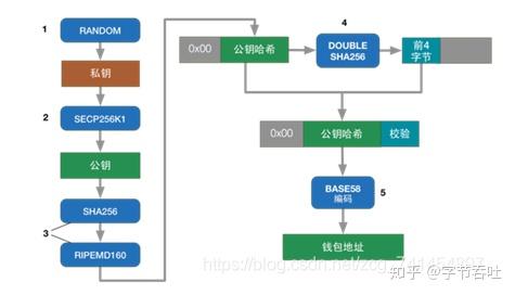 注册成为比特币用户时,系统会根据随机数生成一个私钥,私钥会生成一个公钥,公钥又会生成一个地址,其中私钥必须保密,可以保存到硬盘里或者记到脑子里,因为这个私钥是使用相应地址上的比特币的唯一标识,一旦丢失,所有的比特币将无法使用。下面介绍具体的转换过程,不感兴趣可以不看,只要知道随机数->私钥->公钥->钱包地址这个过程,其中私钥可以对一串字符进行加密,而公钥可以对其进行解密,这就是非对称加密,这类算法总体上的功能都是一样的,只是具体算法有区别,由于这些算法比较复杂,与SHA265算法一样不多做介绍,感兴趣可以深入了解具体算法,但是对于比特币系统,只要了解其功能即可。典型的算法是RSA,比特币采用椭圆曲线加密算法。