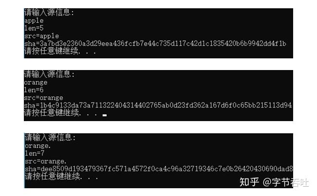 哈希函数又称为数字摘要或散列函数,它的特点是输入一个字符串,可以生成另外一个字符串,但是如果输入不同,输出的字符串就一定不同,而且通过输出的字符串,不能反推出输入。举个简单的例子,对1-100内的数模10,可以认为是一种哈希方法,比如98%10=8,66%10=6,98和66是输入,模10是哈希函数,8和6是输出,在这个模型中,通过6和8无法推断输入是66和98,因为还可能是56和88等,当然因为这个例子比较简单,所以会出现哈希碰撞,即66和56的结果都是6,输出的结果相同。一个优秀的哈希函数,可以做到输出一定不同,哈希碰撞的概率几乎为0。常见的哈希函数有很多,比如MD系列和SHA系列等,比特币采用的SHA256算法,即输入一个字符串,输出一个256位的二进制数。下面是程序运行的结果。