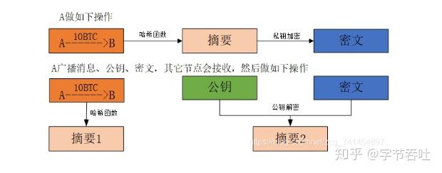 了解了公钥、私钥、地址的概念后,防伪验证的过程就很容易理解,当A发起一笔交易后,对消息进行哈希,生成数字摘要,对数字摘要,通过私钥加密,生成一个密码。之后A会广播这个条交易消息、公钥以及密码。收到消息的人首先对交易信息进行哈希生成摘要1,再通过公钥对密码进行解密,生成摘要2,这样,如果两个摘要相同,说明这个消息确实是A发出的。所谓的签名,就是密文。