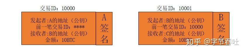 实际上,真实的交易比这个复杂的多,因为有可能是多笔交易构成了输入,比如B->C20个比特币,是由多笔交易A->B10,D->B10构成的,则前一笔交易ID就是两个ID,甚至可能更多。这里为了简单描述,只列举一笔交易。