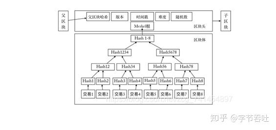 区块体中包含了矿工搜集的若干交易信息,图中假设有8个交易被收录在区块中,所有的交易生成一颗默克尔树,默克尔树是一种数据结构,它将叶子节点两两哈希,生成上一层节点,上层节点再哈希,生成上一层,直到最后生成一个树根,称之为默克尔树根,只有树根保留在区块头中,这样可以节省区块头的空间,也便于交易的验证。