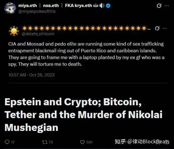 Roger Ver 的「比特币被劫持论」也开始重新得到关注,被认为「他是对的」。@miyaspokeofthis 更是将 Nikolai Mushegian(MakerDAO 联合创始人、WETH 开发领导者)的死亡与爱泼斯坦、Tether 联合创始人 Brock Pierce 以及「比特币被劫持论」结合到了一起,写成了完整的文章。